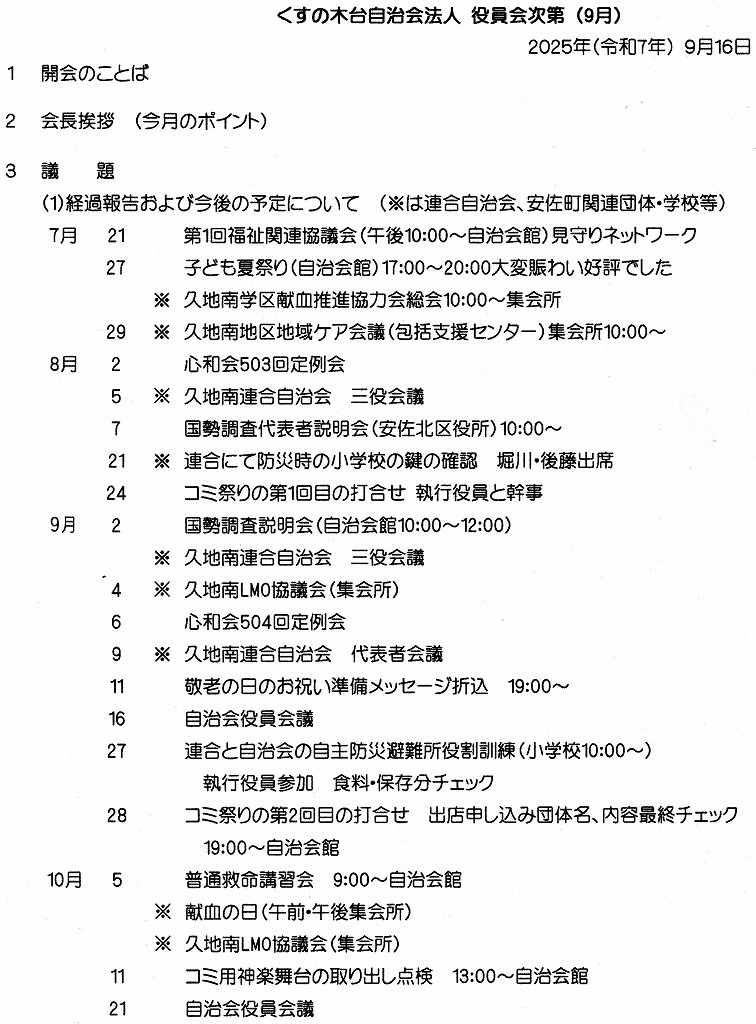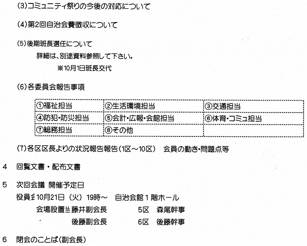 役員会会議資料 (今月と前月の2ヶ月分を掲載) ※ 内容について詳細を知りたい方、疑問点のある方は、 自治会まで、区、名前を告げてご連絡ください。 個人情報保護のため、入会・お悔みおよび業者登録名は掲示していません。