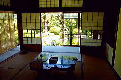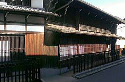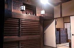 宮島の古い町家は、ふつう間口が狭く奥行きが深くなっています。大戸から入ると奥まで「通り庭」になっておりそれに沿ってミセ(表の間)、オウエ(中の間)、ザシキ(奥の間)に続きます。オウエには天井がなく、戸棚の上には神棚がまつられています。神の島宮島の特徴といえます。
